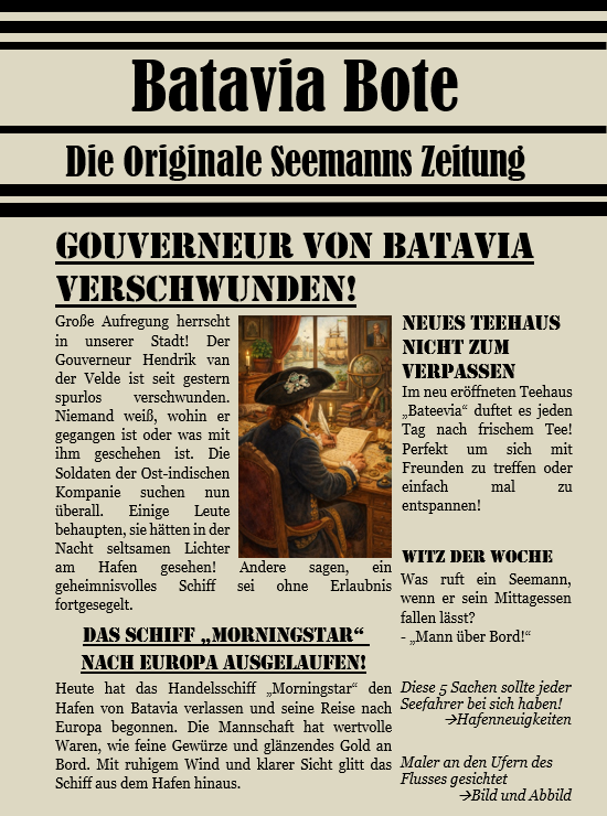 Am Hafen entdeckten wir eine wichtige Spur: Die Brosche des Gouverneurs. Damit war klar: Er wurde auf ein Schiff gebracht. Vom Hafenmeister erfuhren wir, dass an diesem Tag nur ein einziges Schiff ausgelaufen war: Die "Morningstar", unterwegs in Richtung Europa.